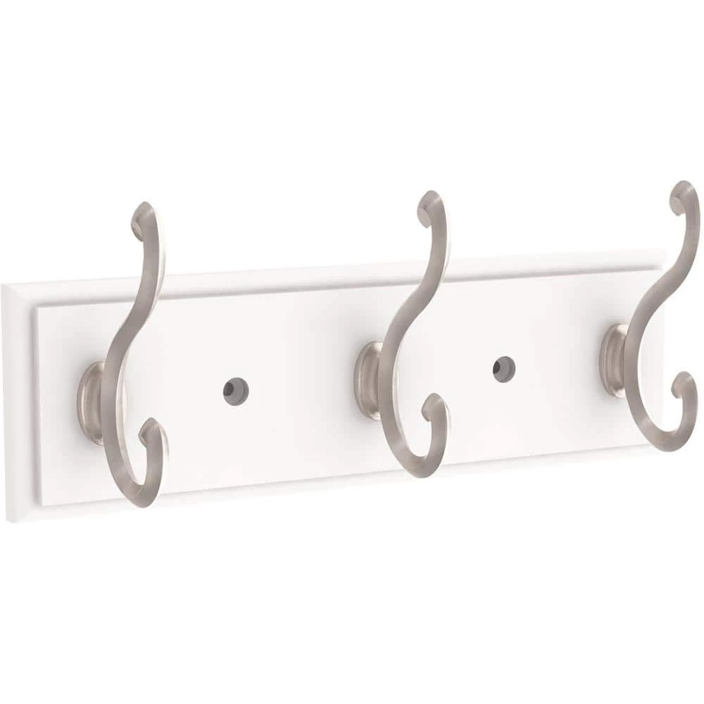 - Sleek pure white rack finish with classic satin nickel hooks offers a timeless touch that matches any home decor