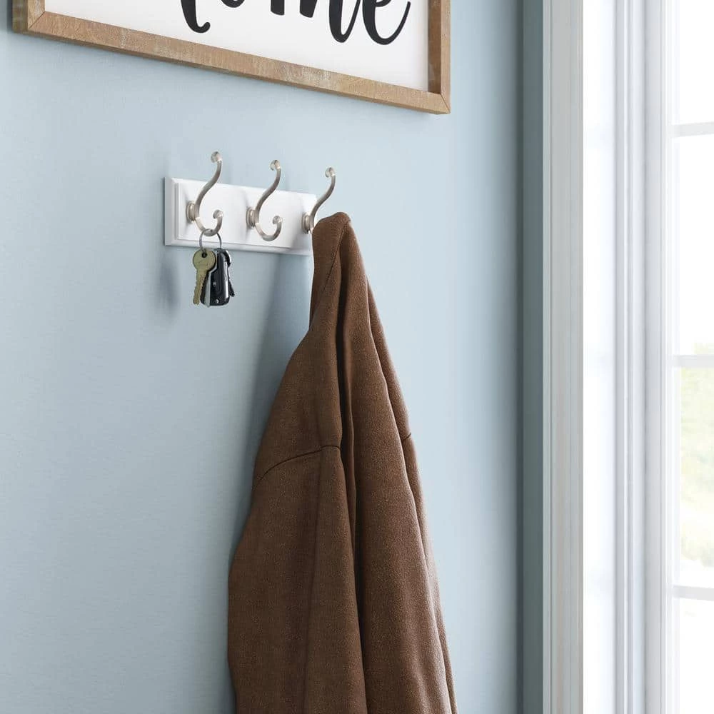 This 10 in. 3-Scroll Hook Rack combines design with functionality. This exquisite white rack with 3 satin nickel hooks is the perfect solution for organizing your home in stylish splendor. It’s a great addition to any room in your home that needs a little help controlling the clutter.