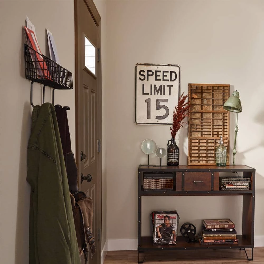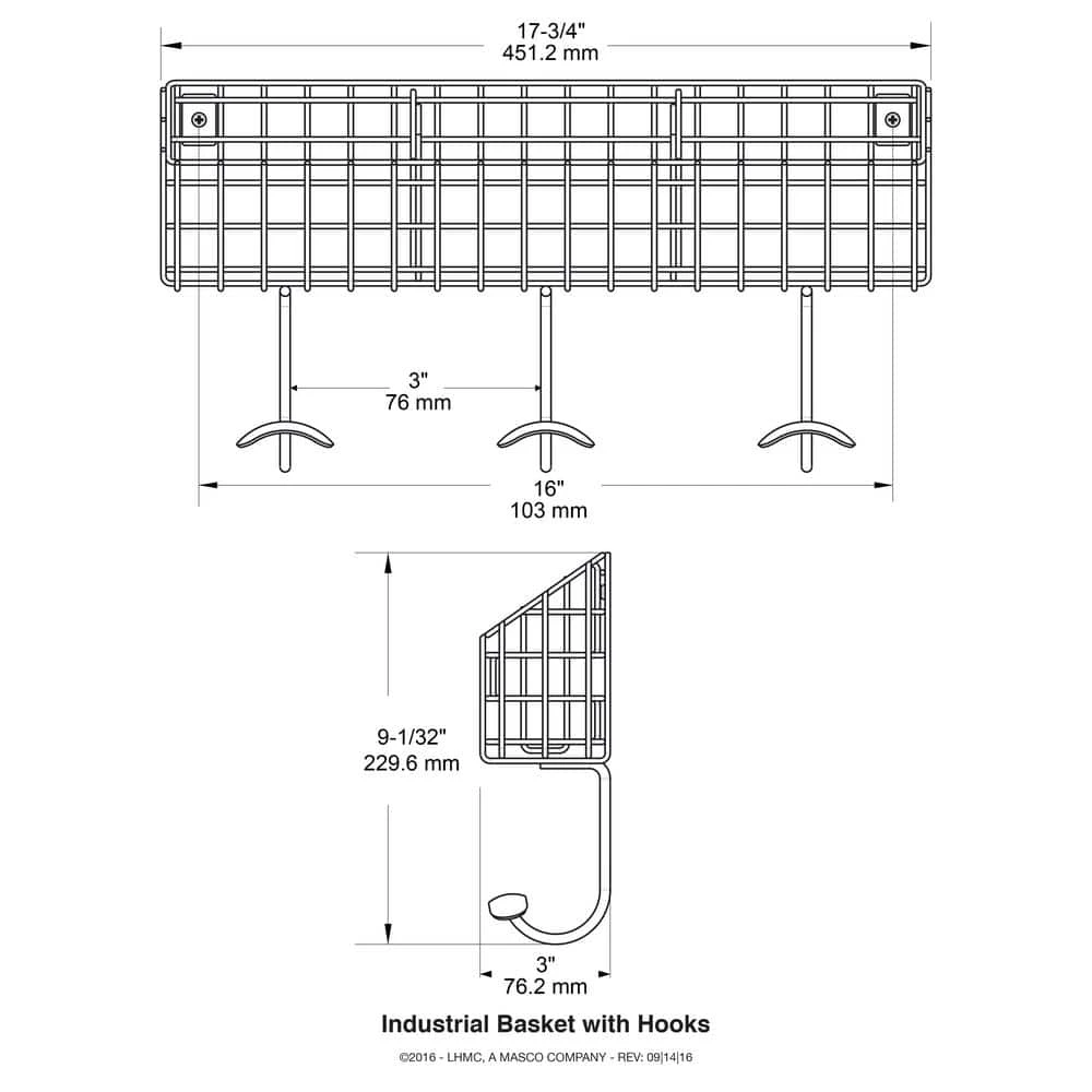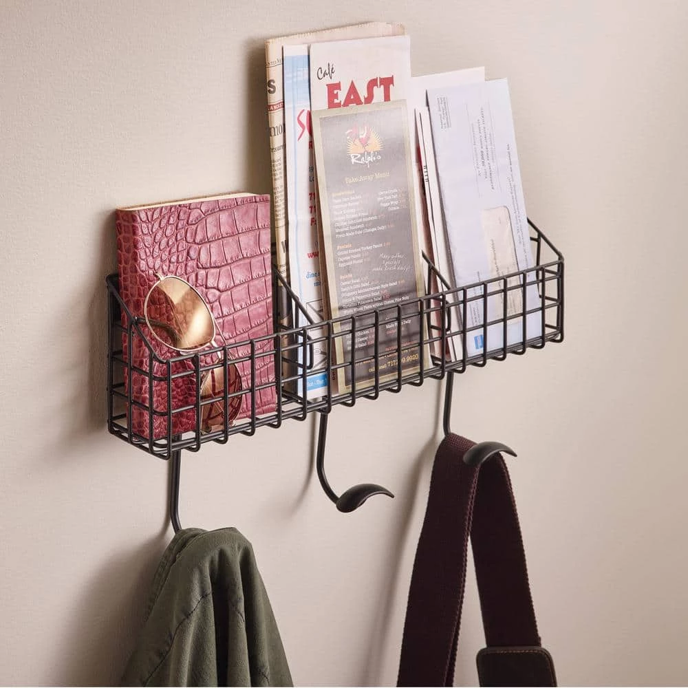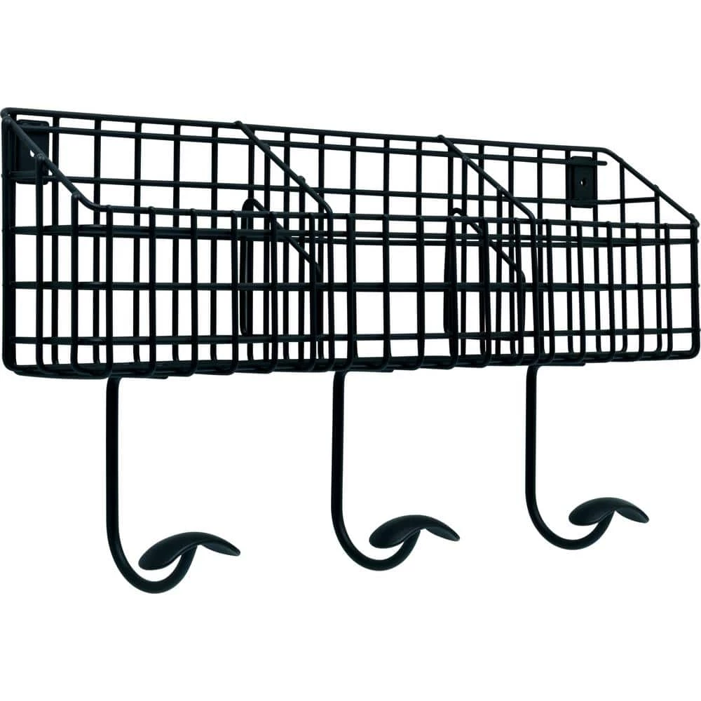 Inspired by schoolhouse industrial decor, the Industrial Basket Hook rack, in a Matte Black finish, gives you the ability to organize with style. This versatile basket hook rack gives you 3 hooks for hanging your coats, book bags, purses and more. The compartmentalized basket adds an extra area for stowing your mail, wallet or other loose items.