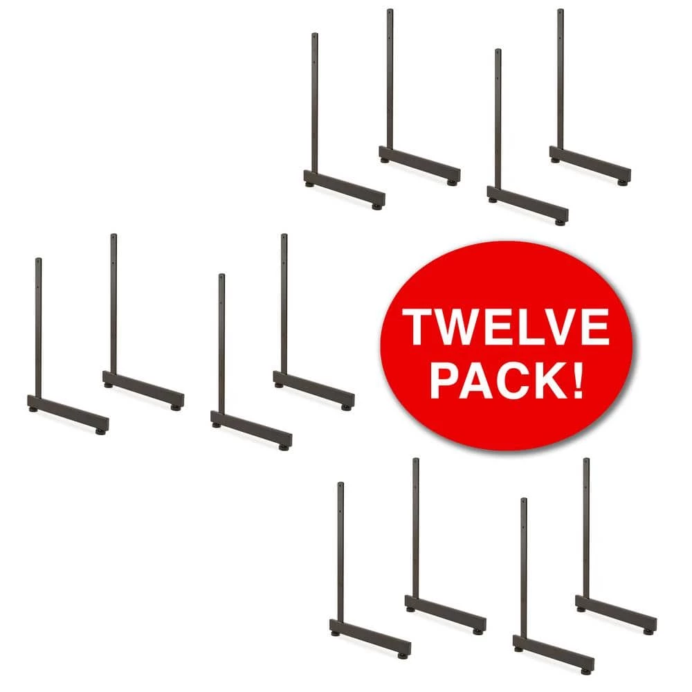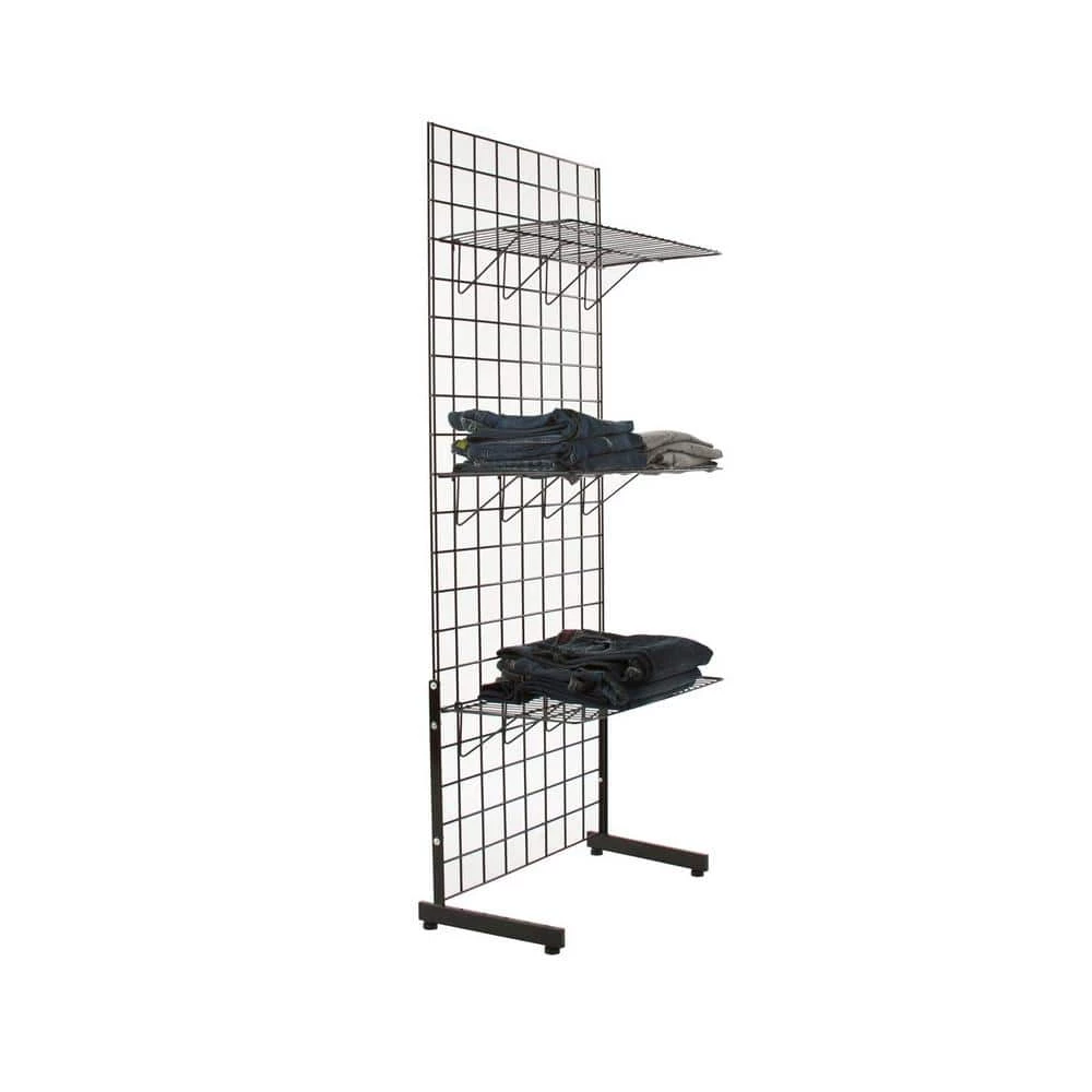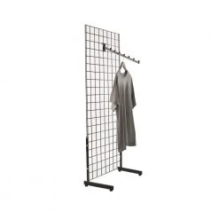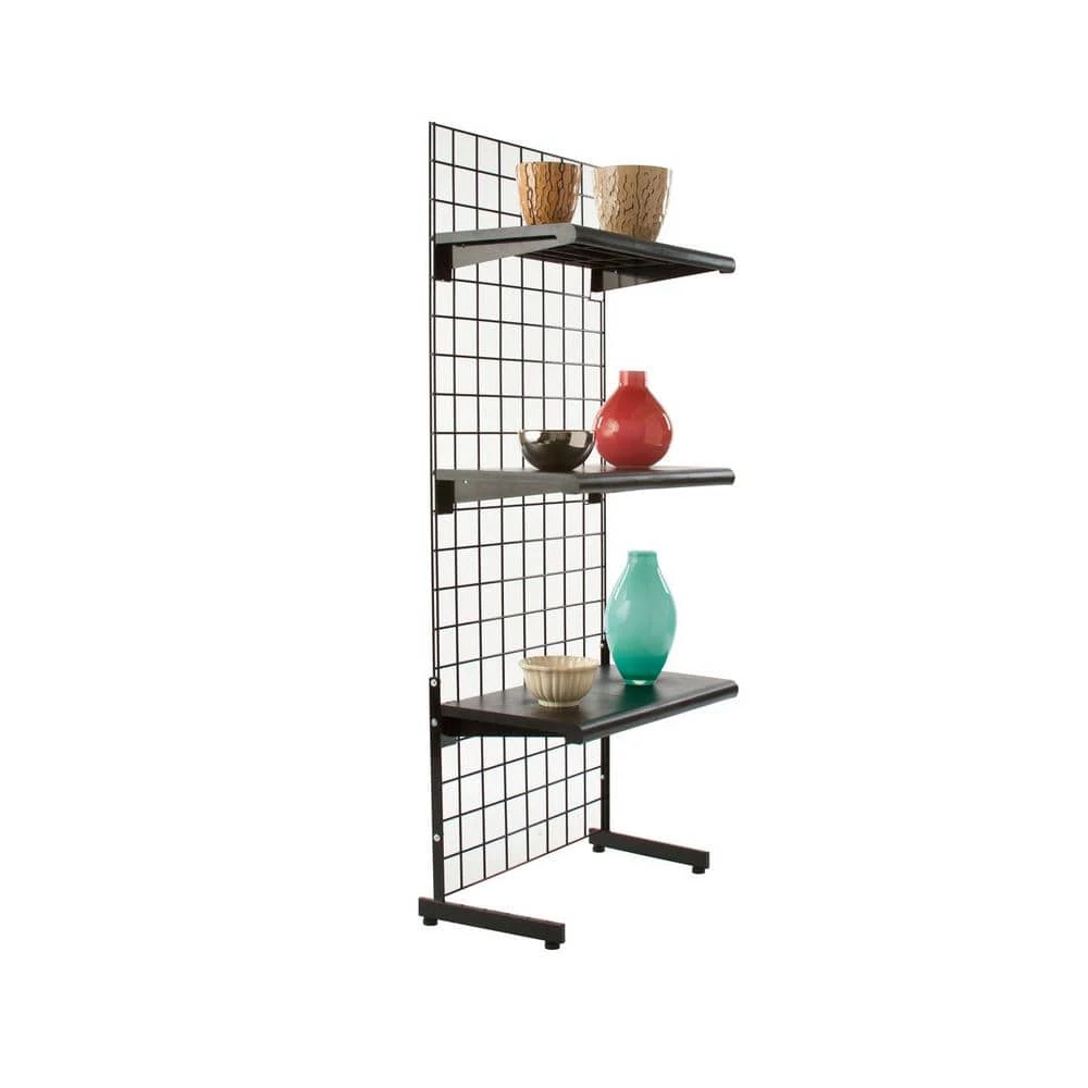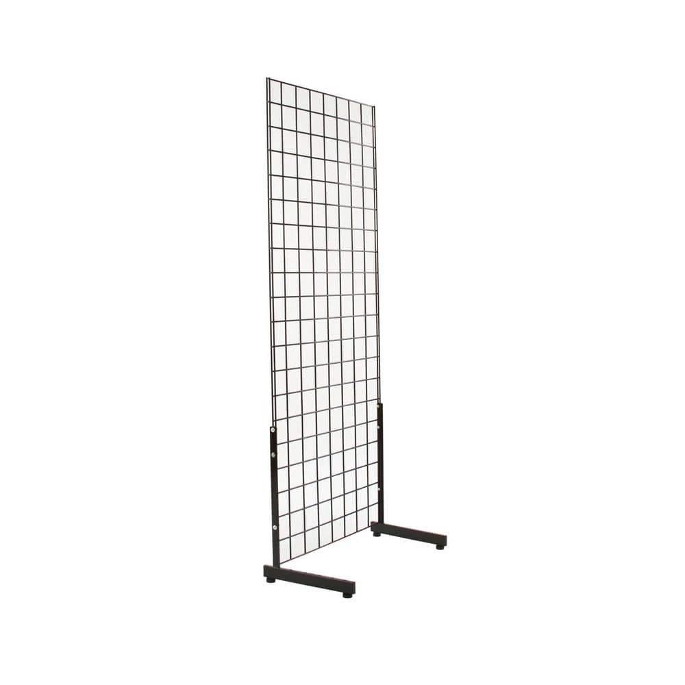 Use in pairs. Allows a grid or slat grid panel to be a become free-standing, one-sided display to use against a wall. Add hooks, baskets, shelves or face outs. Great for retail or home storage.