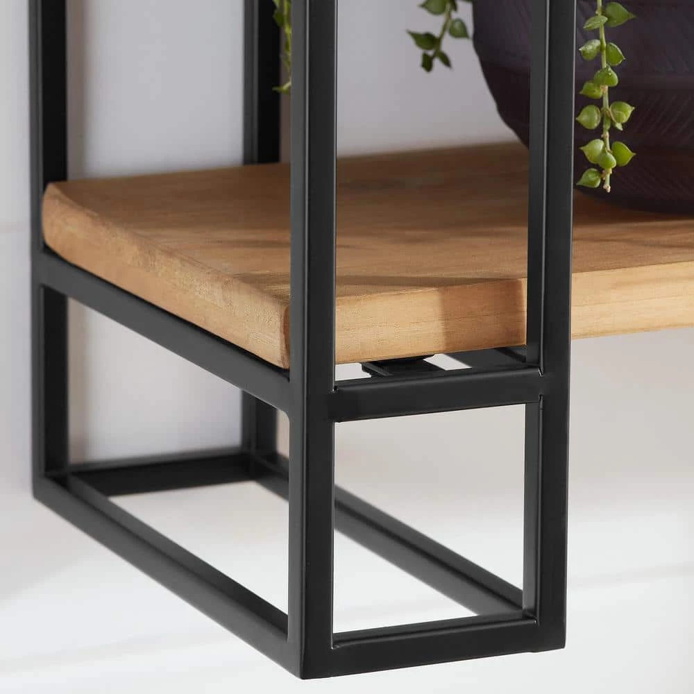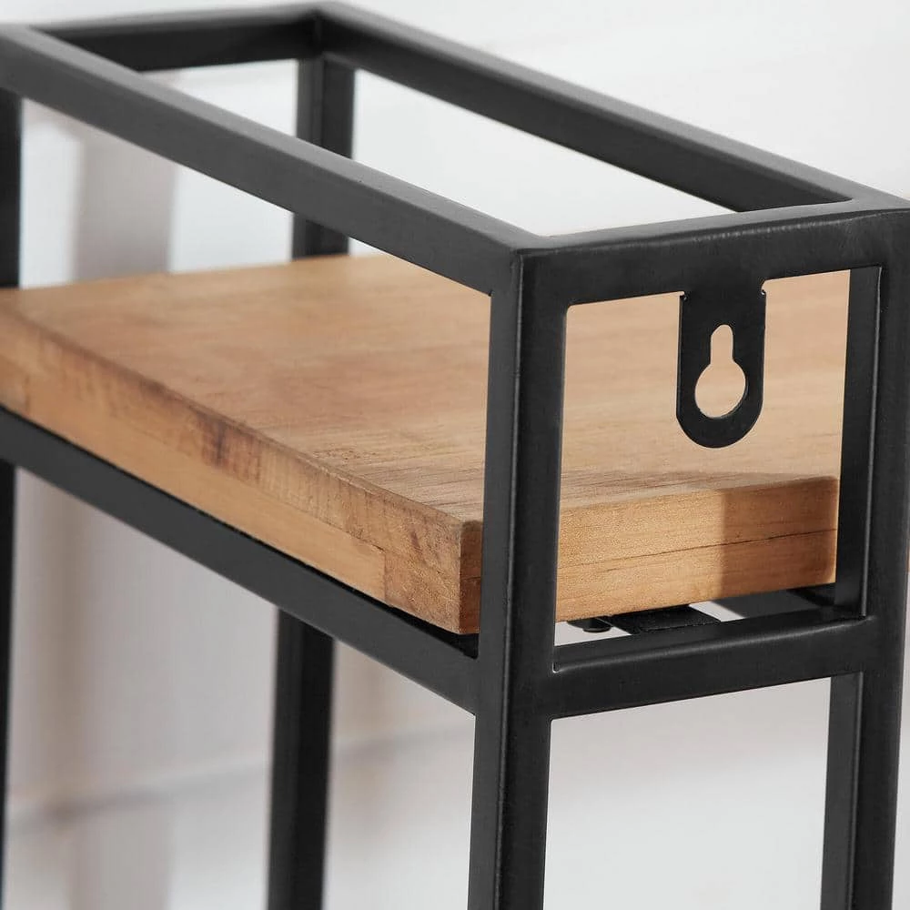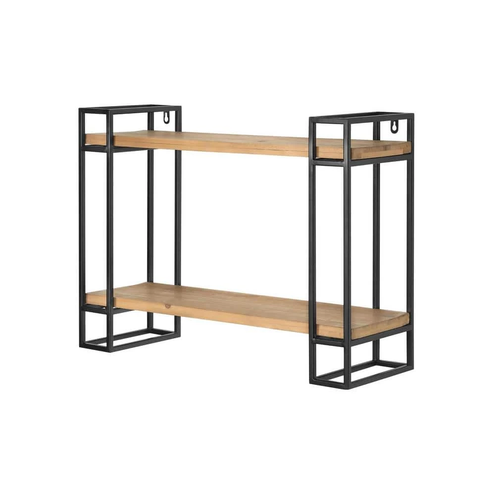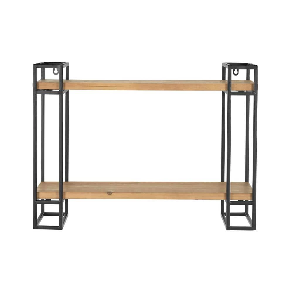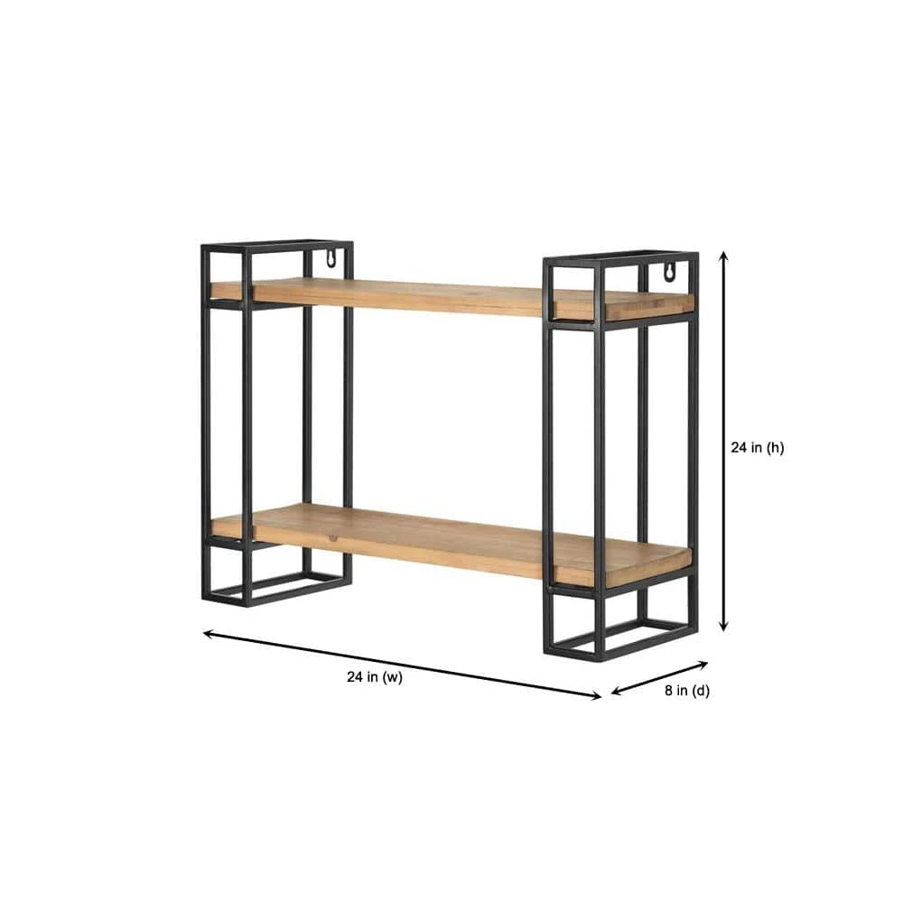 The Wood and Black Metal Wall-Mount Bookshelf from Home Decorators Collection is a fashionable and functional addition to your farmhouse-style decor. It features a natural brown finish that adds a vintage look to your kitchen, living room, dining room, or den. It is crafted from sturdy wood that ensures high durability and long-term use. Thanks to its 20 lbs. total weight capacity, this wall shelf is ideal for organizing and displaying potted plants, framed family photos, and dinnerware.