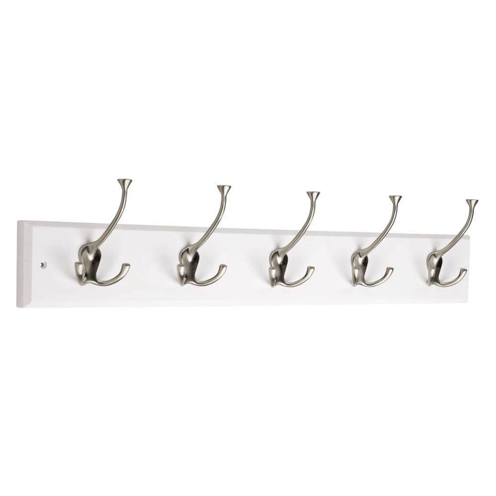 - Bright white rack with elegant satin nickel hooks adds style and class