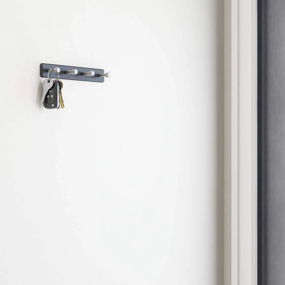The 8 in. metal key rack can be used in the entryway to store and organize keys or in the closet for belts and ties. 4 Satin Nickel Hooks are mounted on a matte black rack. For ease, mounting hardware is included.